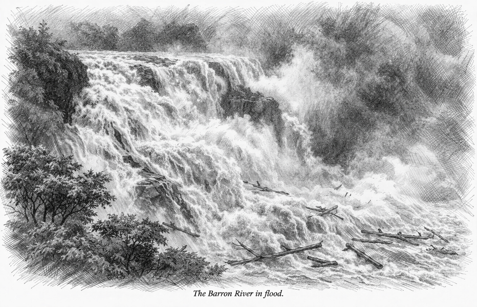 The image above shows the Barron River in flood. This is the river the Mazlin brothers attempted to use to carry their cedar logs to the coast. The attempt failed, and the loss was considerable.